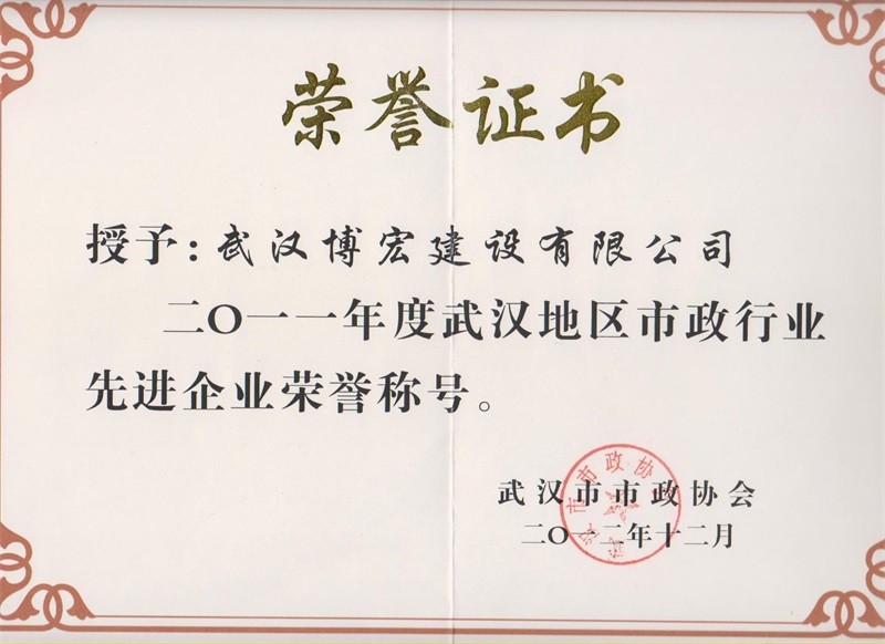 2011年度武漢地區(qū)市政行業(yè)先進(jìn)企業(yè)榮譽(yù)稱號(hào)