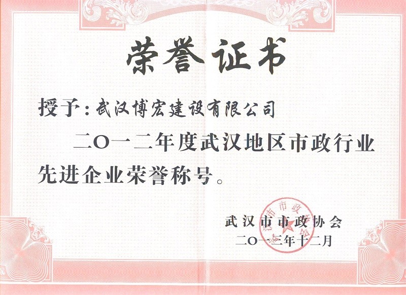 2012年度武漢地區(qū)市政行業(yè)先進(jìn)企業(yè)榮譽(yù)稱號(hào)