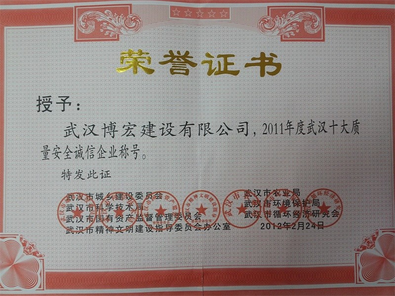 2011年度武漢十大質(zhì)量安全誠信企業(yè)稱號(hào)