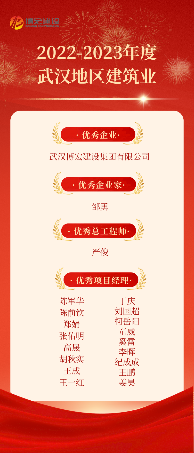 近日,2022-2023年度武漢地區(qū)建筑業(yè)優(yōu)秀企業(yè)、優(yōu)秀企業(yè)家、優(yōu)秀總工程師、優(yōu)秀項(xiàng)目經(jīng)理選樹(shù)結(jié)果正式發(fā)布,博宏建設(shè)集團(tuán)喜獲“大豐收”,獲評(píng)1項(xiàng)優(yōu)秀企業(yè)、1人獲評(píng)優(yōu)秀企業(yè)家、1人獲評(píng)優(yōu)秀總工程師、17人獲評(píng)優(yōu)秀項(xiàng)目經(jīng)理!